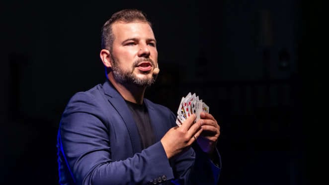 Najlepszy iluzjonista w Kościerzynie to jednak przede wszystkim specjalista od magicznych sztuczek. Swój potencjał najlepiej pokazuje na dużej scenie, którą można przygotować w hotelu czy sali bankietowej.